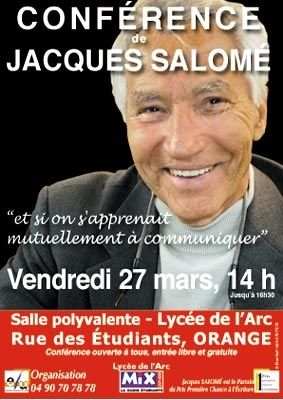 14h, Alain Enjolras de MIX, la radio étudiante, rappelle que cette conférence est organisée conjointement par Expressions Littéraires Universelles, le lycée de l'arc et la radio qu'il représente. Le sourire aux lèvres, il peut introduire le conférencier, Jacques Salomé, d'une manière sommaire : 74 ans, infirme de la communication…