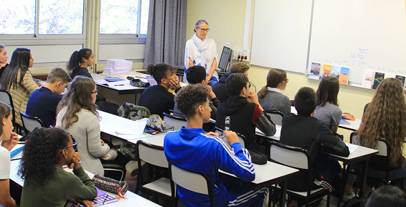 Ce mardi 8 octobre à 11 h, une partie de l’équipe adulte du Prix a eu le plaisir de découvrir la classe de seconde du lycée de l’Arc qui allait participer à l’aventure du Prix cette année. Véronique Ruiz, professeure de lettres, et Corinne Niederhoffer, éditrice, ont présenté les rouages et les enjeux du Prix, accompagnées par Nina, une élève de première volontaire cette année, Françoise Humbert, lectrice du comité de sélection, Thomas Hintermeier, ancien lycéen aujourd’hui étudiant et membre du Conseil d’administration de l’association ELU, et Dominique Lin, auteur. Chacun a présenté son expérience, sa vision et ce qu’il allait apporter en éclairage aux rencontres avec les élèves.