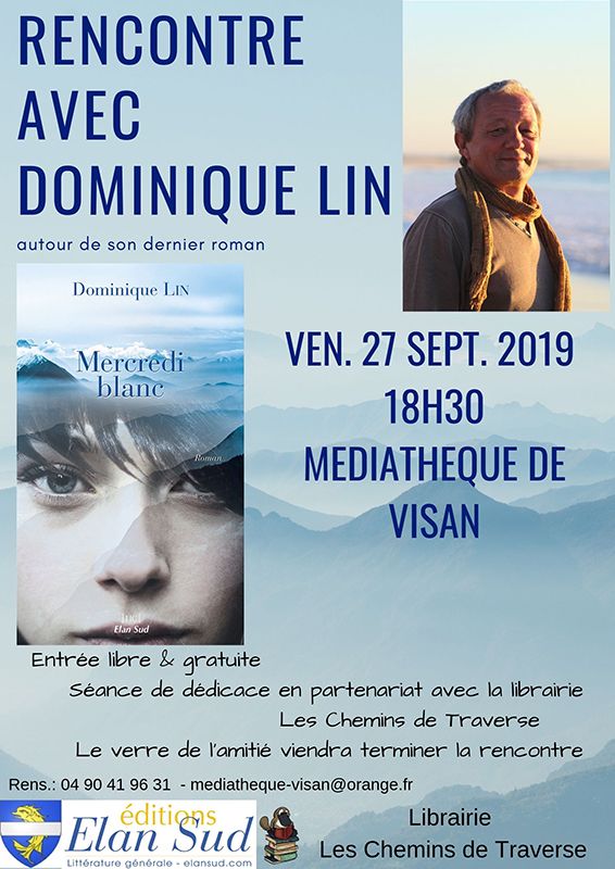 • Vendredi 27, Dominique Lin invité à la médiathèque de Visan à 18h30, 197 Avenue du Général de Gaulle (84) en collaboration avec la librairie de Valréas, Les Chemins de Traverse. Rencontre autour de son 7e roman, Mercredi blanc, suivie d'un verre de l'amitié.