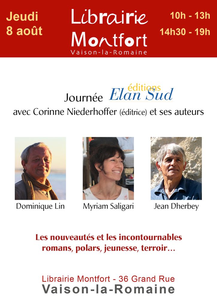 • Jeudi 8, journée spéciale Elan Sud à la librairie Montfort à Vaison-la-Romaine en compagnie de Myriam Saligari, Dominique Lin et Jean Dherbey. De 10h à 13h et de 14h30 à 19h. Cette journée se situe pendants Les Choralies de Vaison. Nombreuses chorales en ville et spectacles gratuits.