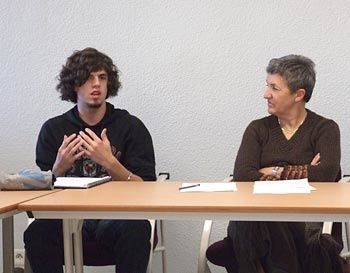 Corinne a ensuite invité Alicia Fertig à partager son expérience du Prix, elle qui n'avait, au départ, pas eu du tout d'inspiration sur le thème 2008, "Couleurs et sons". Grand bien lui a pris de passer l'été 2007 à écrire "1200 mots par jour", comme elle se plait à le rappeler. "Je m'imposais d'écrire tous les jours, sinon, j'aurais eu le double de travail le lendemain". Cet engagement envers elle-même, elle l'a tenu, et la première récompense, c'était d'avoir réussi, d'être allé au bout. Un défi pour elle qui n'écrivait jusqu'alors que des nouvelles ou s'essayait à la BD.