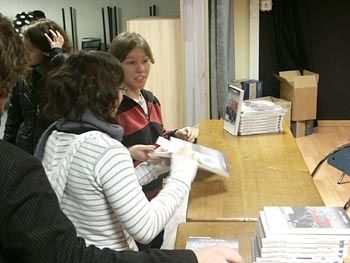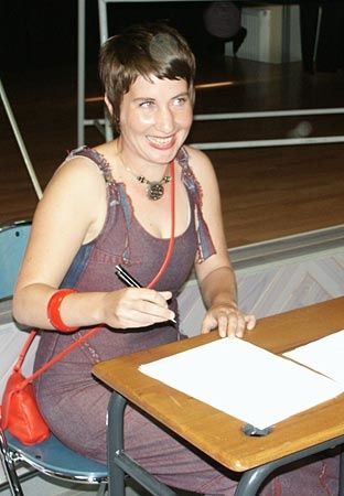Corinne a ensuite invité Alicia Fertig à partager son expérience du Prix, elle qui n'avait, au départ, pas eu du tout d'inspiration sur le thème 2008, "Couleurs et sons". Grand bien lui a pris de passer l'été 2007 à écrire "1200 mots par jour", comme elle se plait à le rappeler. "Je m'imposais d'écrire tous les jours, sinon, j'aurais eu le double de travail le lendemain". Cet engagement envers elle-même, elle l'a tenu, et la première récompense, c'était d'avoir réussi, d'être allé au bout. Un défi pour elle qui n'écrivait jusqu'alors que des nouvelles ou s'essayait à la BD.