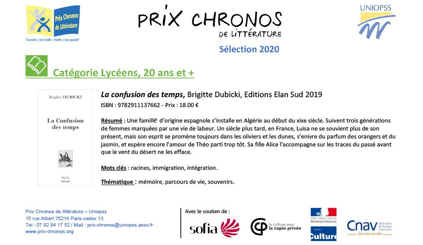 Vous comprendrez pourquoi Brigitte Dubicki a été agréablement surprise lorsqu'elle a appris qu'elle figurait dans la sélection du Prix 2020 avec son premier roman La Confusion des temps paru en juin dans la collection élan d'elles. Son roman entre complètement dans la ligne éditoriale de ce Prix.